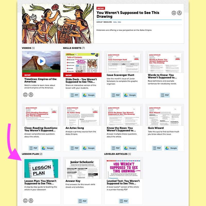 Every issue of Junior Scholastic comes with lesson plans for our feature articles. These lesson plans offer scaffolded instruction, pre-reading activities, discussion questions based on critical Social Studies and ELA skills, and extension activities that keep the learning going after students have read the article.