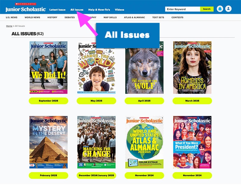 At the top of any Junior Scholastic webpage, click All Issues. From here, you can scroll through to find all of our available issues from previous publishing years.